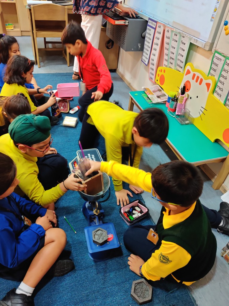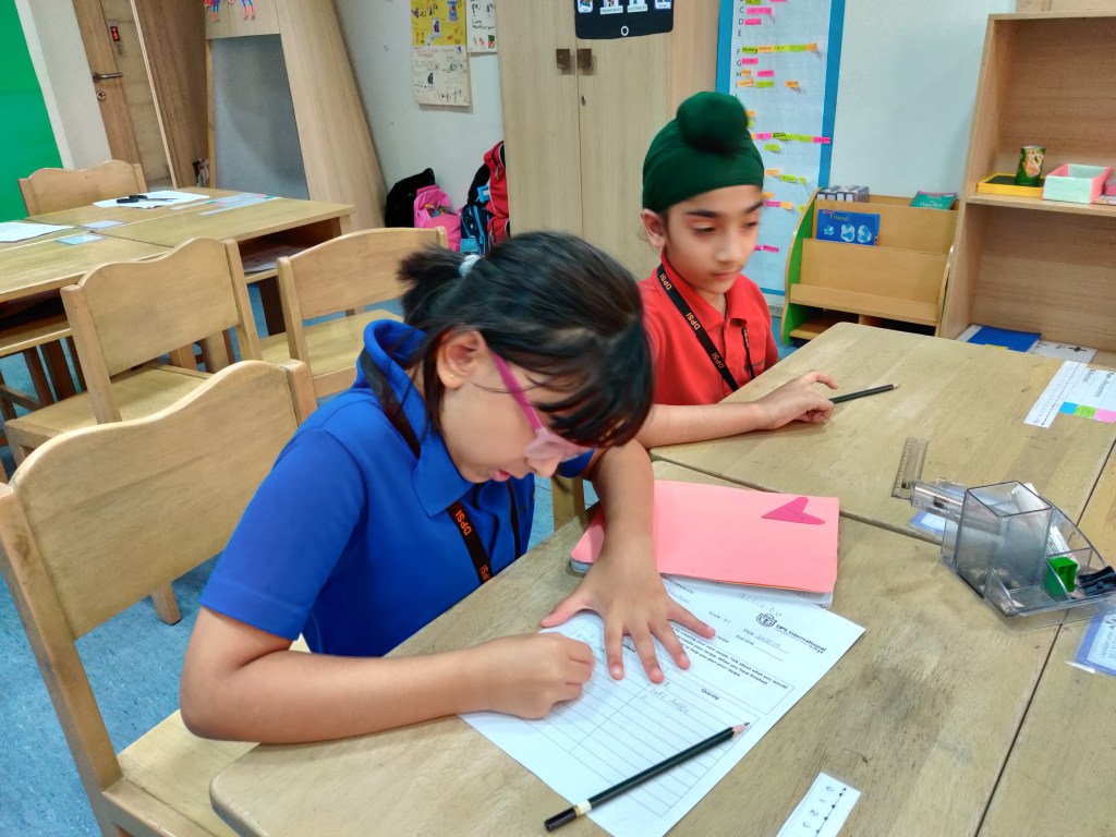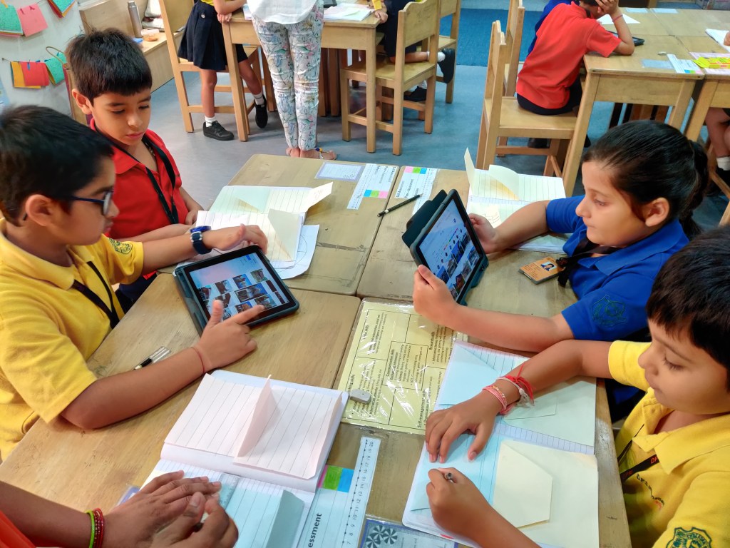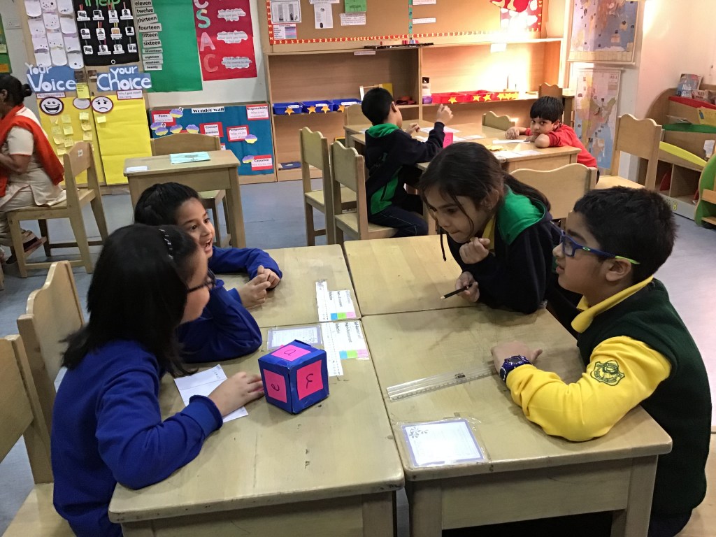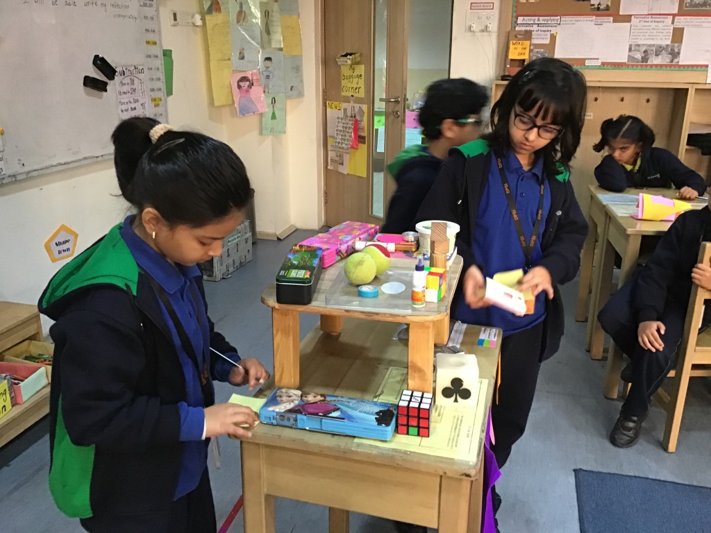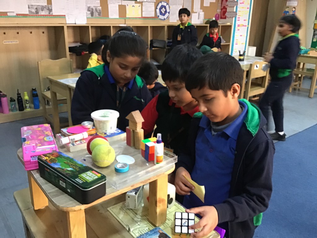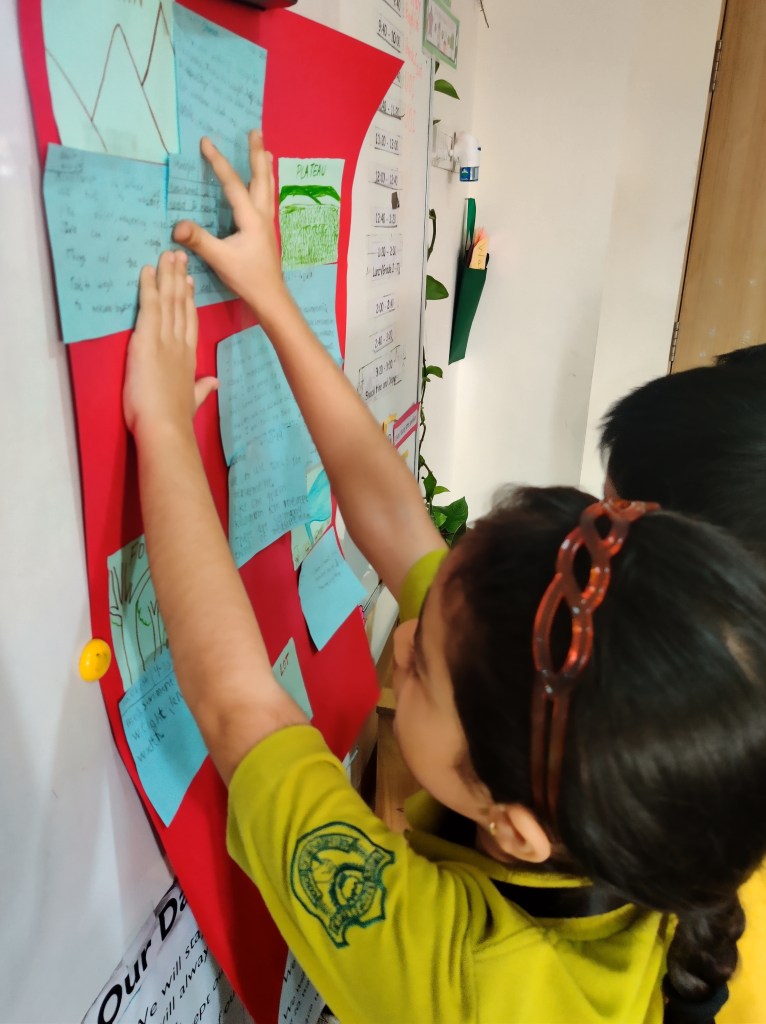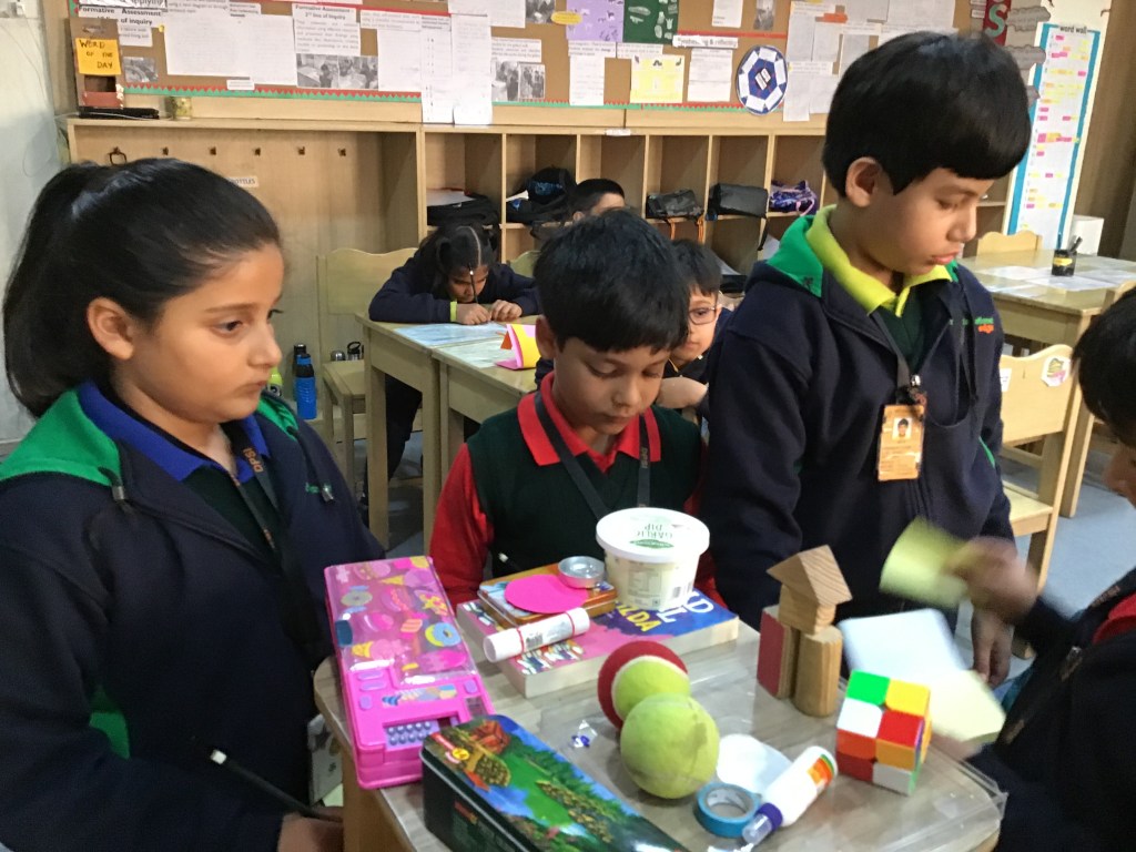 Students were introduced to shapes and their properties with the help of a mystery bag activity and they recorded their observations using ‘think-pair-share’ visible thinking routine.
