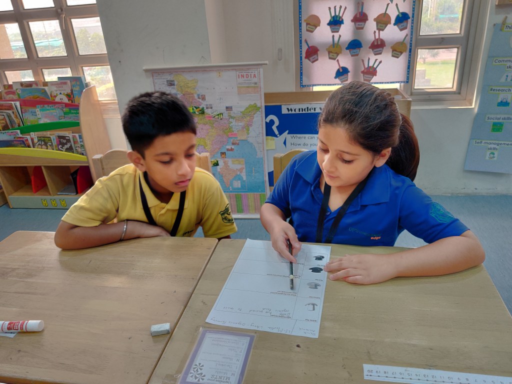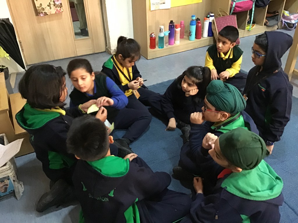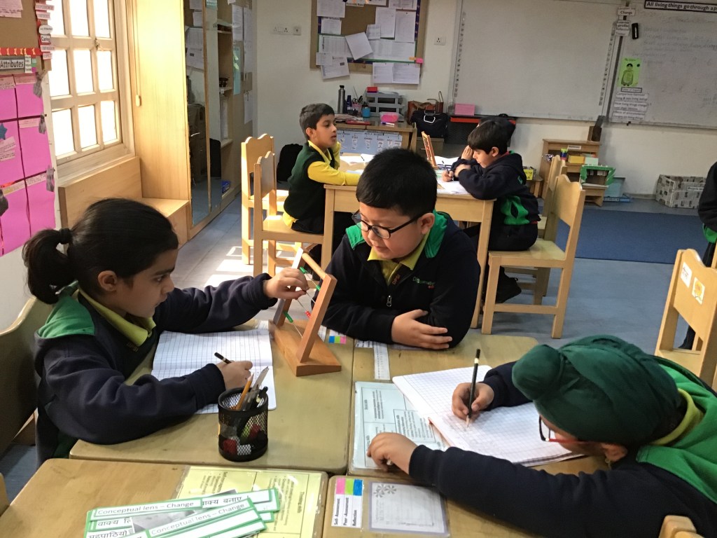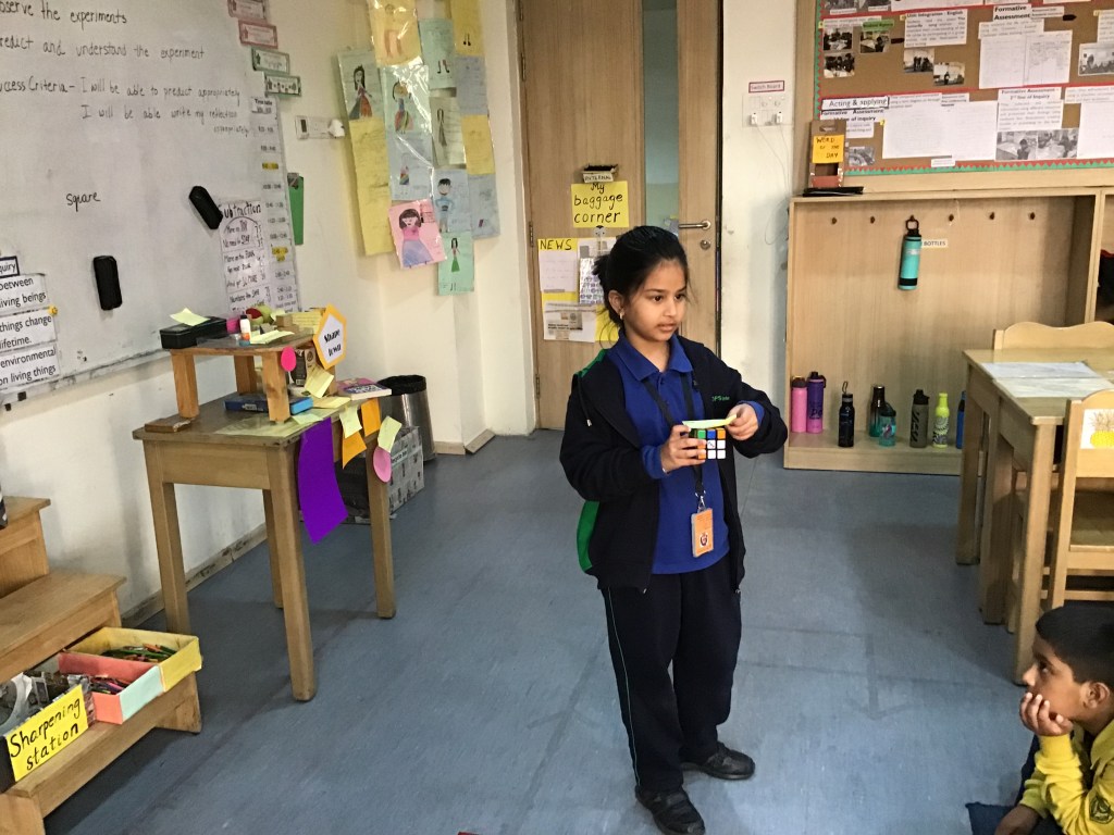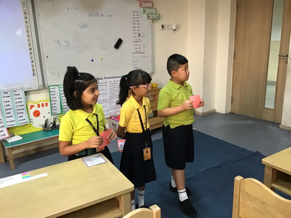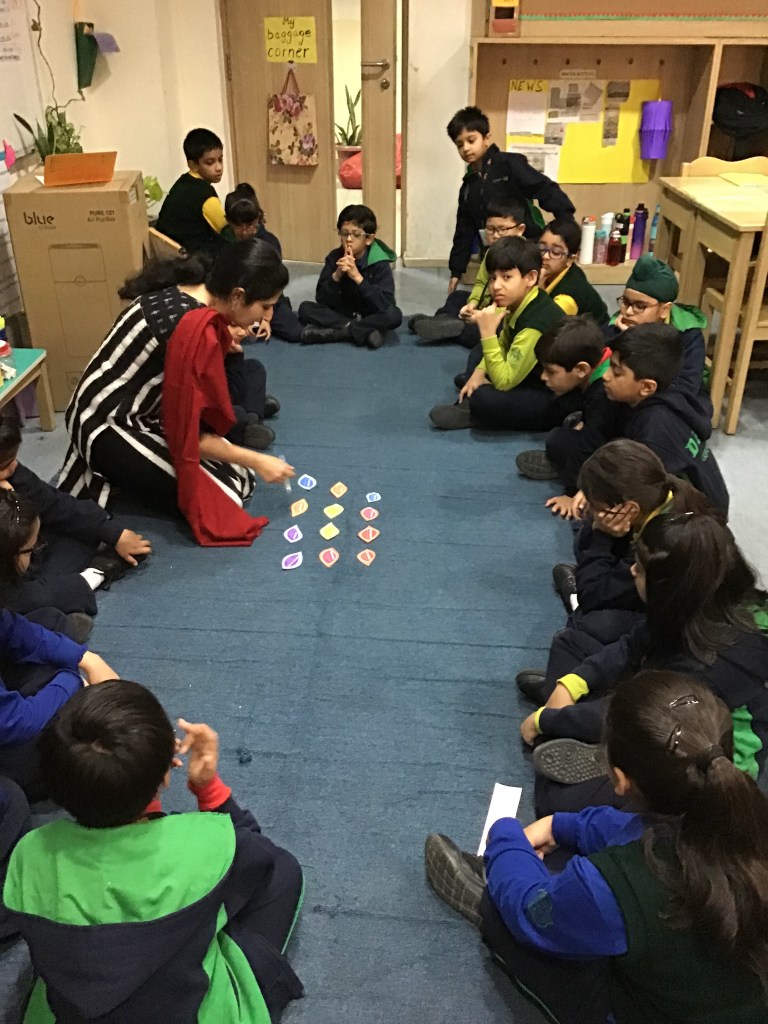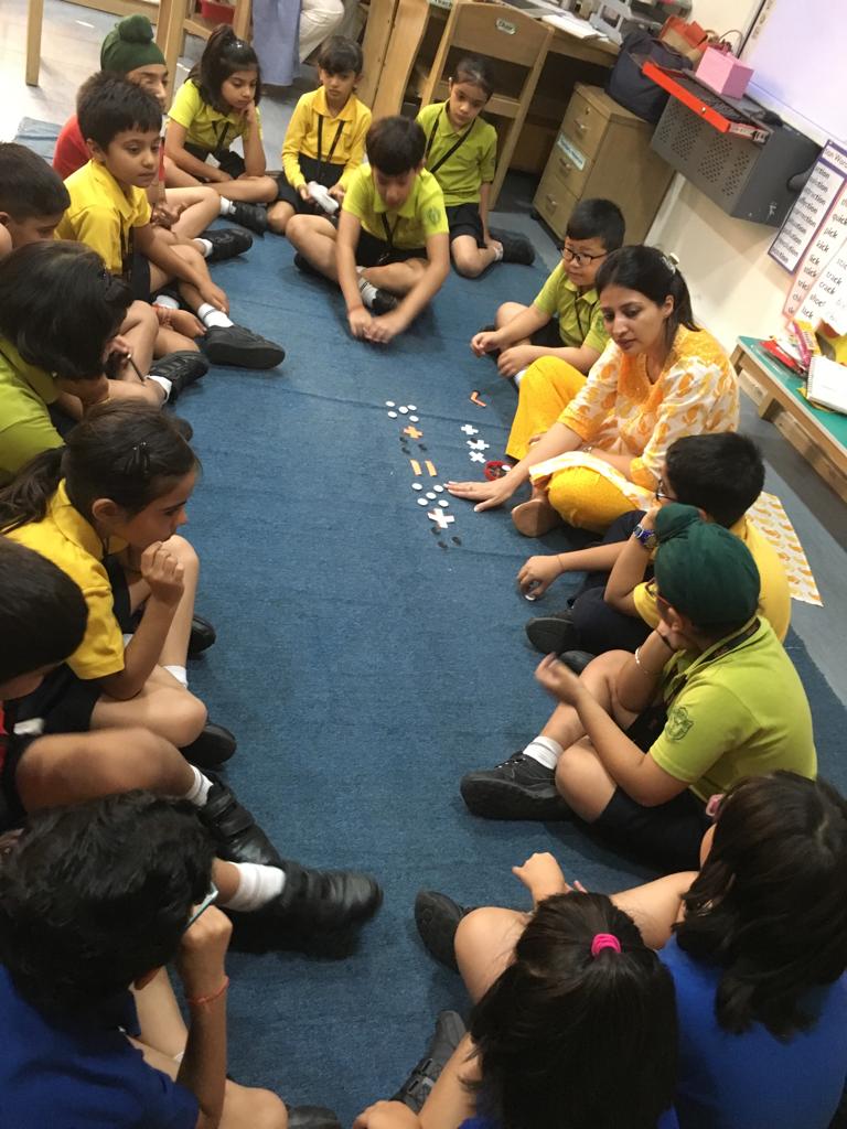 Students were introduced to shapes and their properties with the help of a mystery bag activity and they recorded their observations using ‘think-pair-share’ visible thinking routine.
