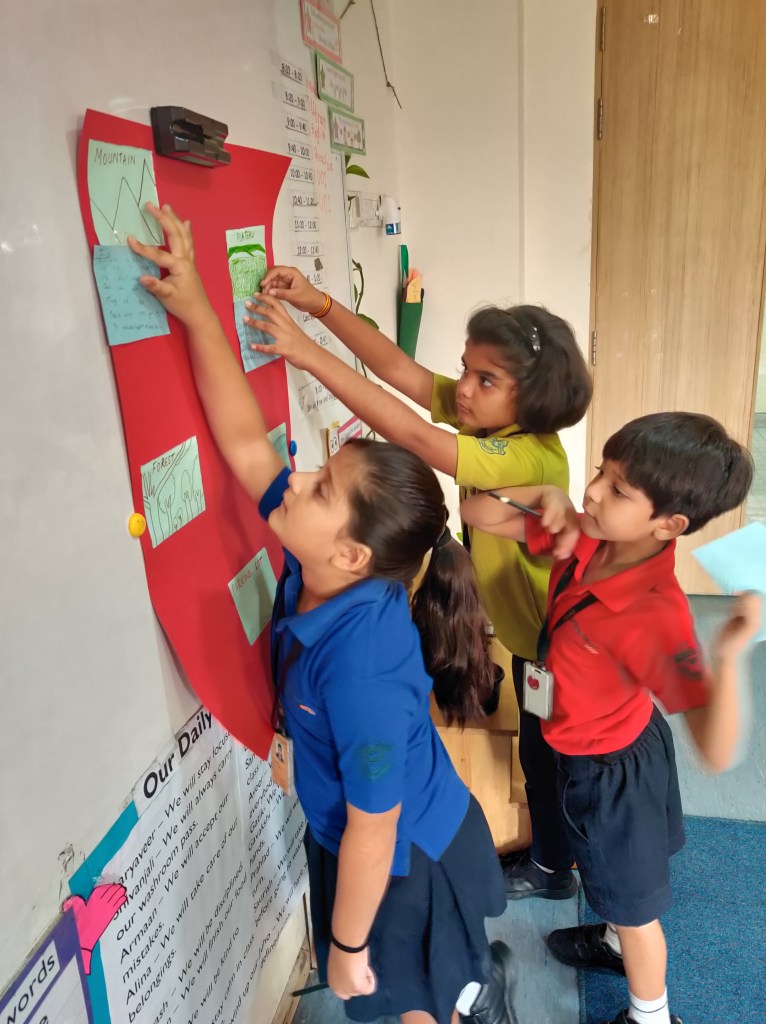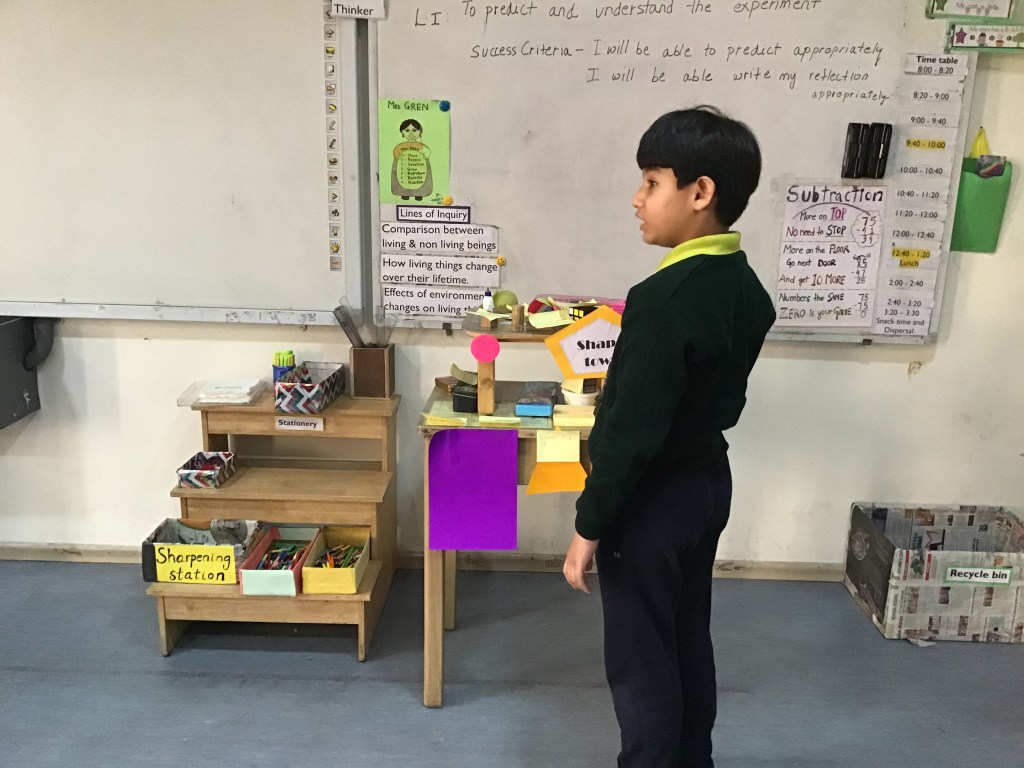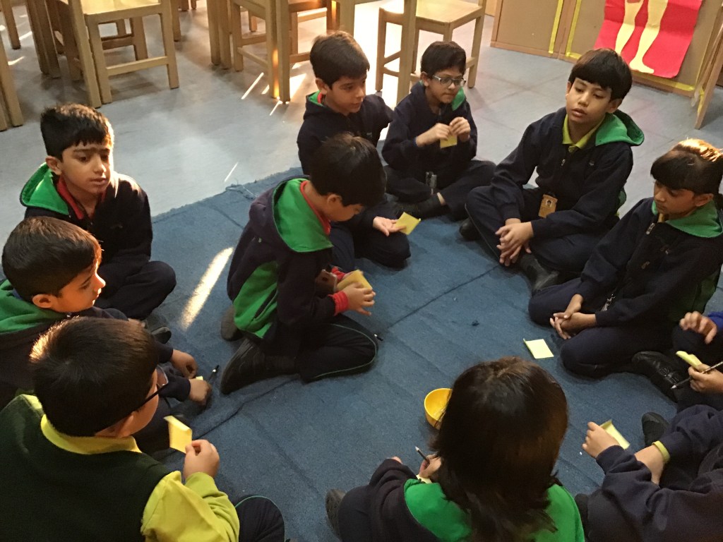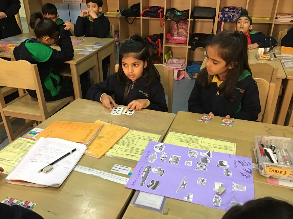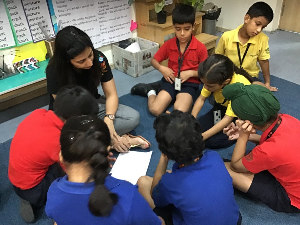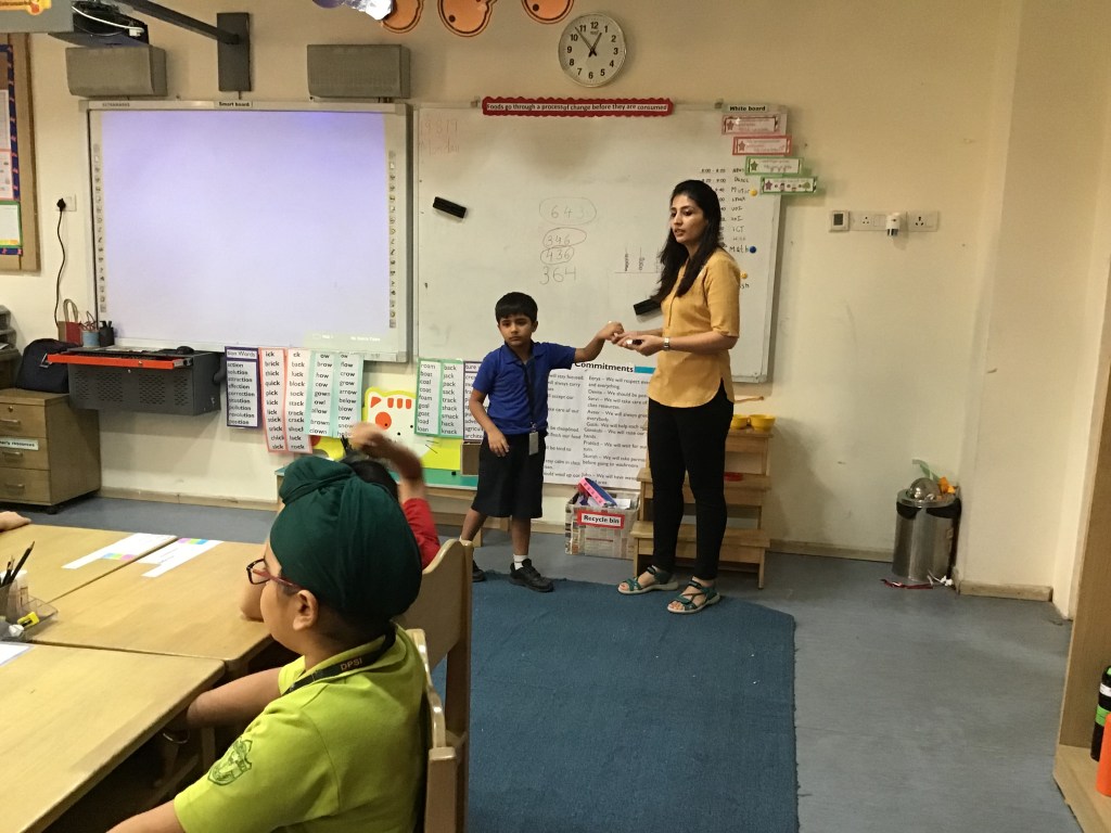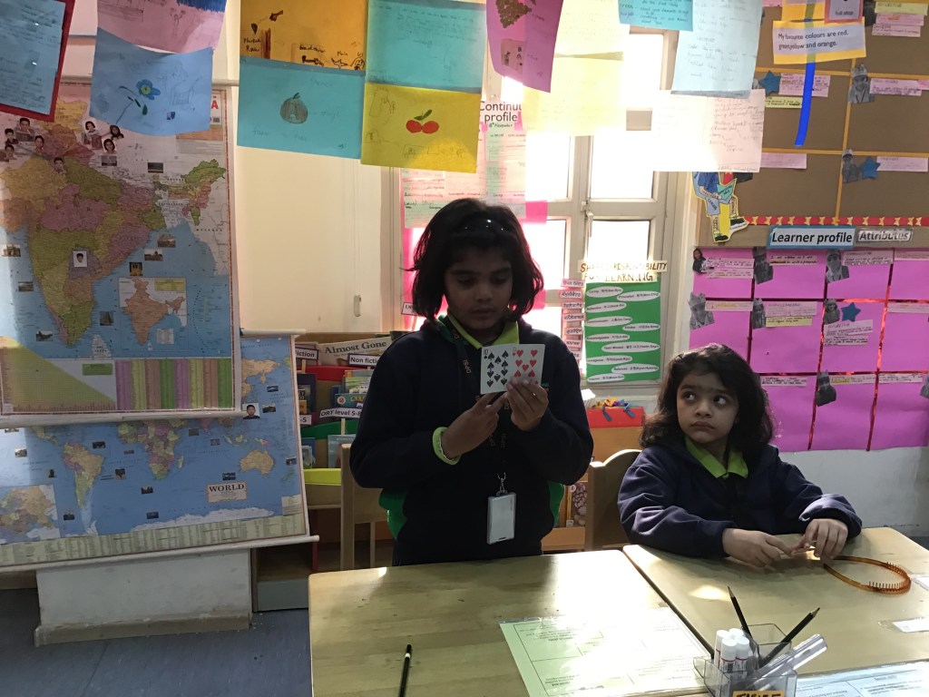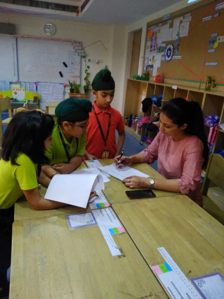 Students were introduced to shapes and their properties with the help of a mystery bag activity and they recorded their observations using ‘think-pair-share’ visible thinking routine.