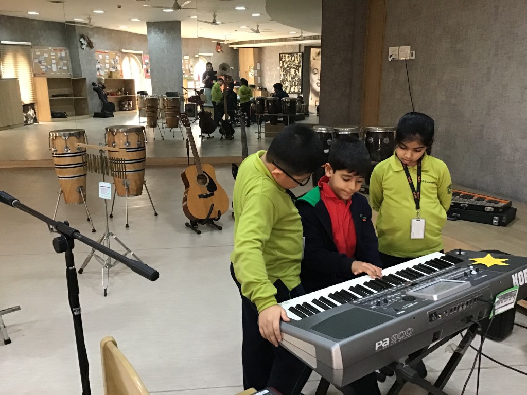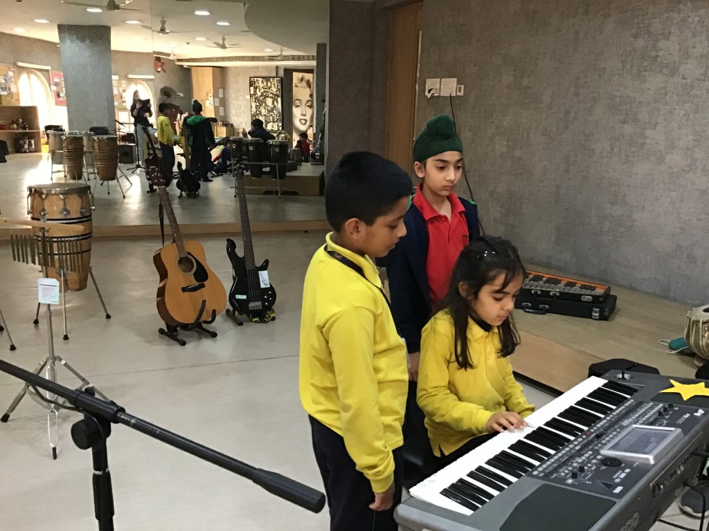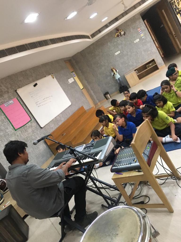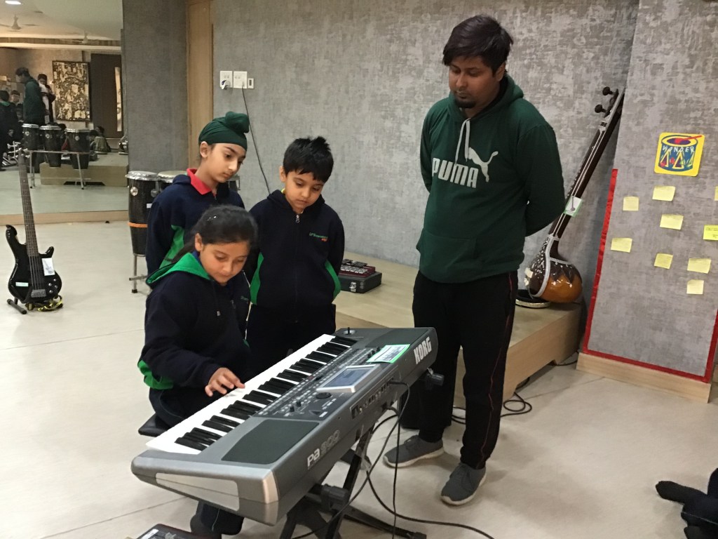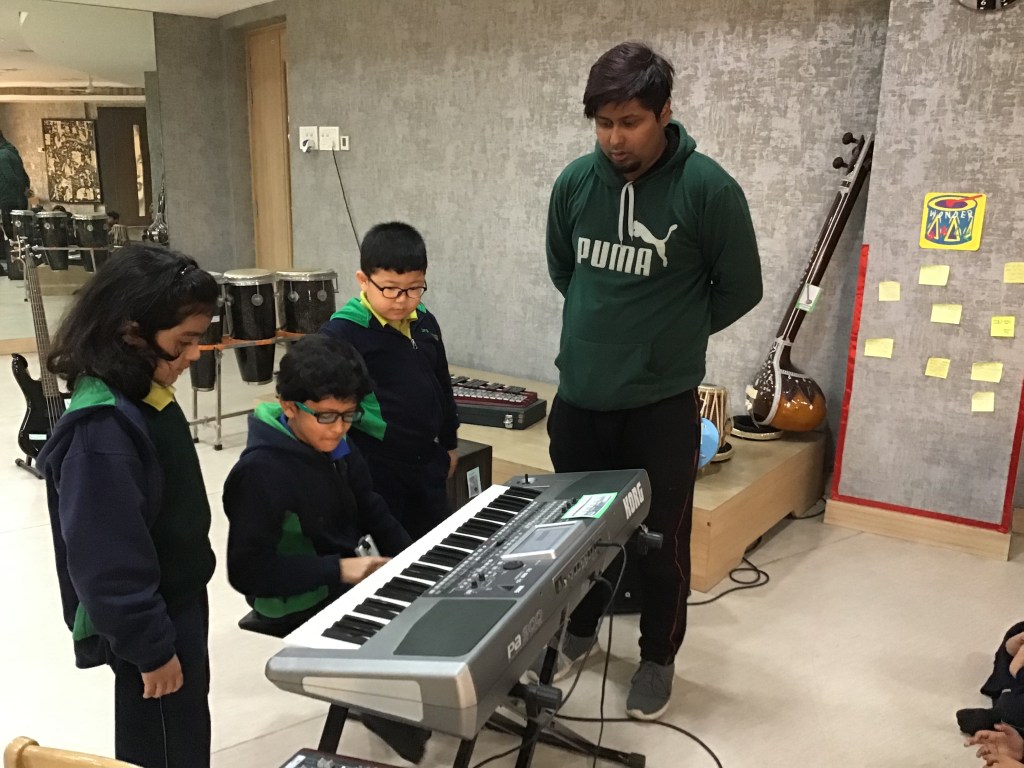 During music lessons, students learned about notes on a keyboard. They practiced the correct finger movement patterns with right hand to play a keyboard/piano.