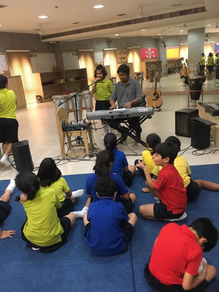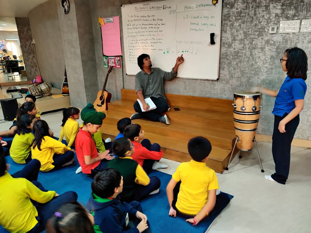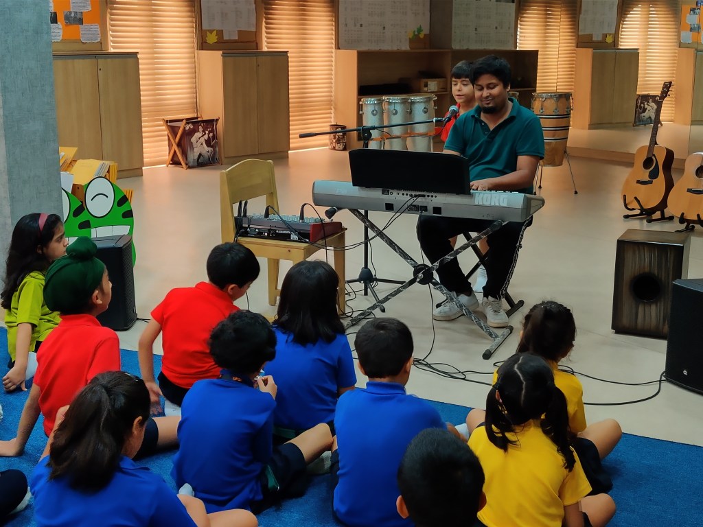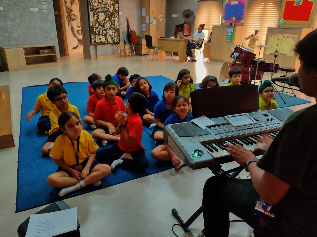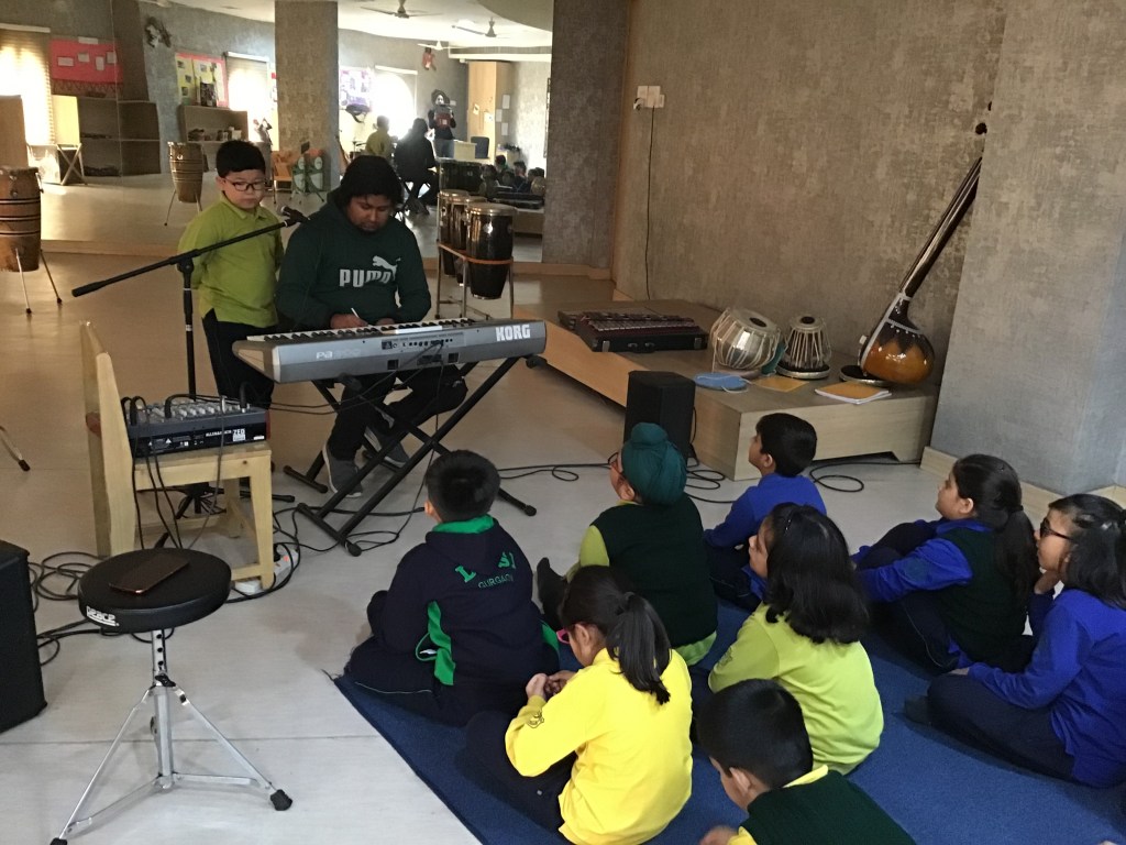 During music lessons, students learned about notes on a keyboard. They practiced the correct finger movement patterns with right hand to play a keyboard/piano.